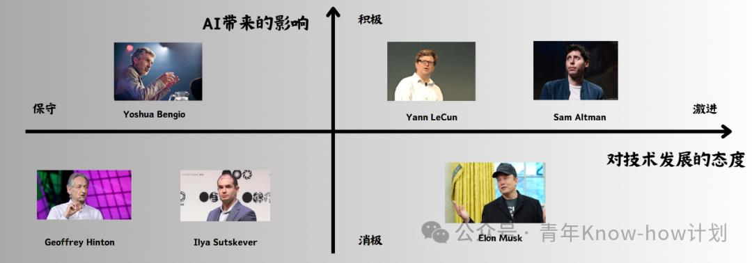 在保守阵营中,技术保守派 × 消极影响论者Geoffrey Hinton(图灵奖+诺贝尔物理学奖得主)的转变极具象征意义。这位深度学习教父从技术布道者变为敲钟人,其忏悔录式的宣言"AI威胁超过气候变化",恰似原子弹之父奥本海默的历史重演。更具戏剧性的是OpenAI前首席科学家Ilya Sutskever的出走,当安全委员会被商业化浪潮吞没,技术理想主义者的退场成为行业转型的注脚。